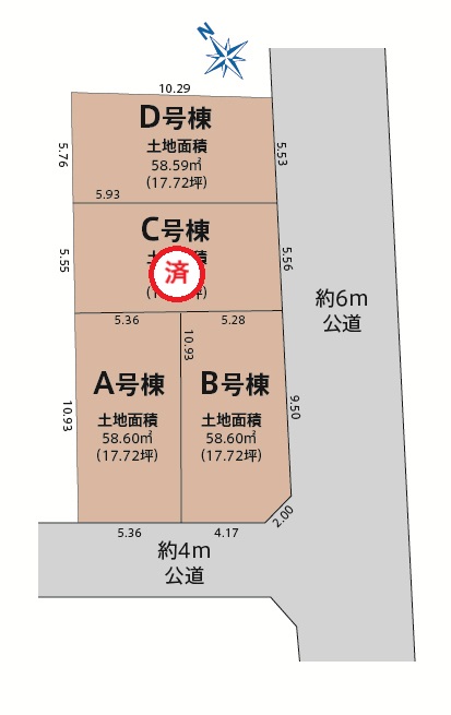 | 土地面積 | A号棟:58.60㎡(17.72坪) D号棟:58.60㎡(17.72坪) |